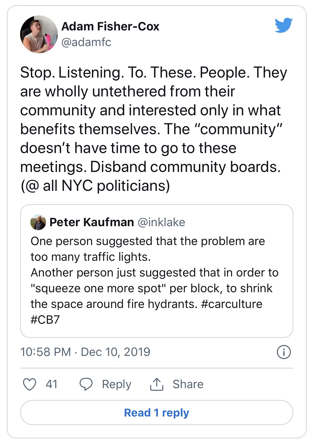 While it is certainly fair for you to seek out and be appointed to a community board seat, it is conversely also fair for this community board to be aware of the yimby collective opinion of community boards and your determined wish to eliminate them from the housing discourse landscape.