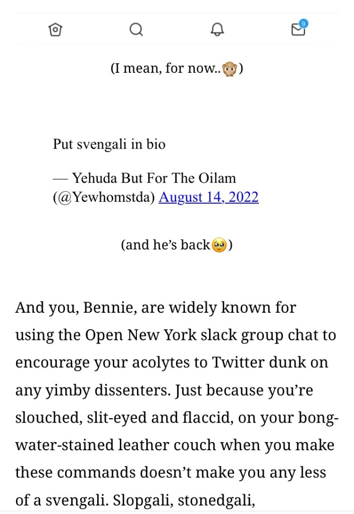 And you, Bennie, are widely known for using the Open New York slack group chat to encourage your acolytes to Twitter dunk on any yimby dissenters. Just because you’re slouched, slit-eyed and flaccid, on your bong-water-stained leather couch when you make these commands doesn’t make you any less of a svengali. Slopgali, stonedgali, wellfedgali, sure, sure: also you. But svengali fits.