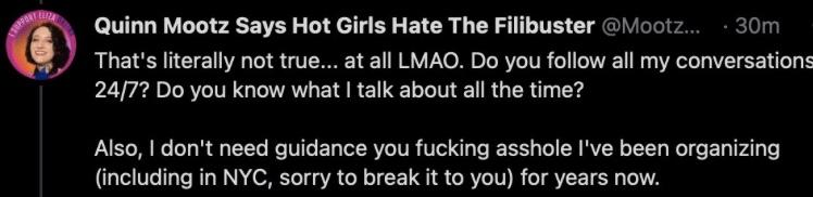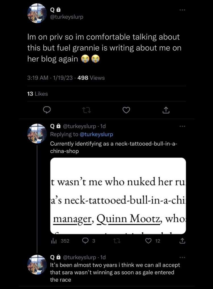 (Fuelfluence fun fact: you had added “hot girl” to your Twitter handle because I and others had called out Sara for referring to herself as a “hot girl,” a misstep which won her no votes but to which you had angrily attached yourself because you, like your fellow yimby Hayden Barkin Dogs McClarkin, have never met any fight you didn’t like.)