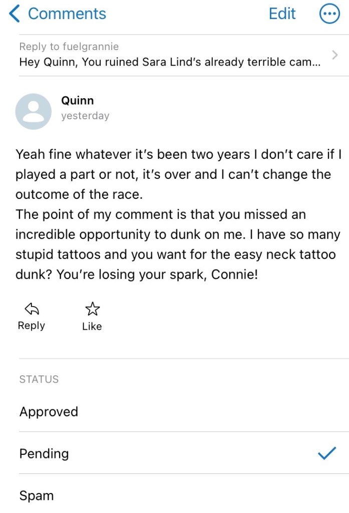 I mean, the minute I saw Sara there, I instantly recalled how she had blamed me personally for chasing her off Twitter (“death threats!!!!!😤🍼😫”) and ultimately causing her to lose her race.