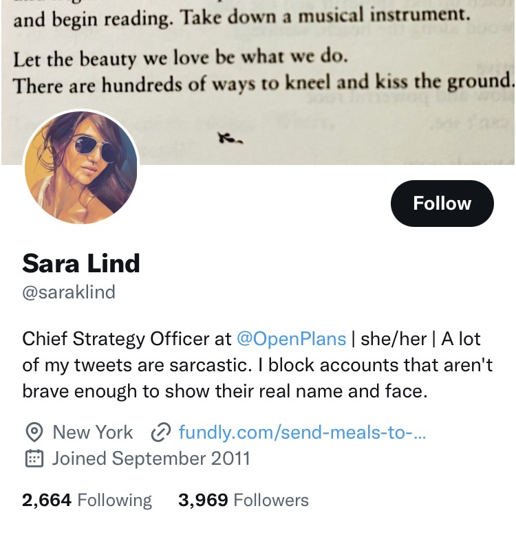 A hilariously telling aside: Sara Lind claims to block people on Twitter who “aren’t brave enough to show their real face.”