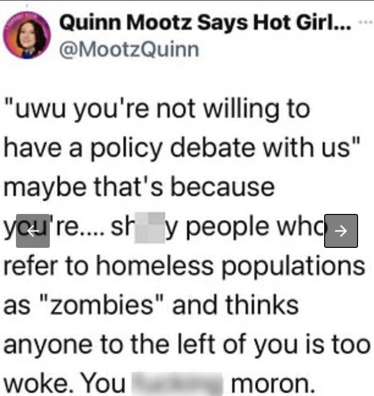 Hypocritical, no? Also hypo-typical of you, as you seamlessly vibrate between victim and bully, Quinn Mootz.
